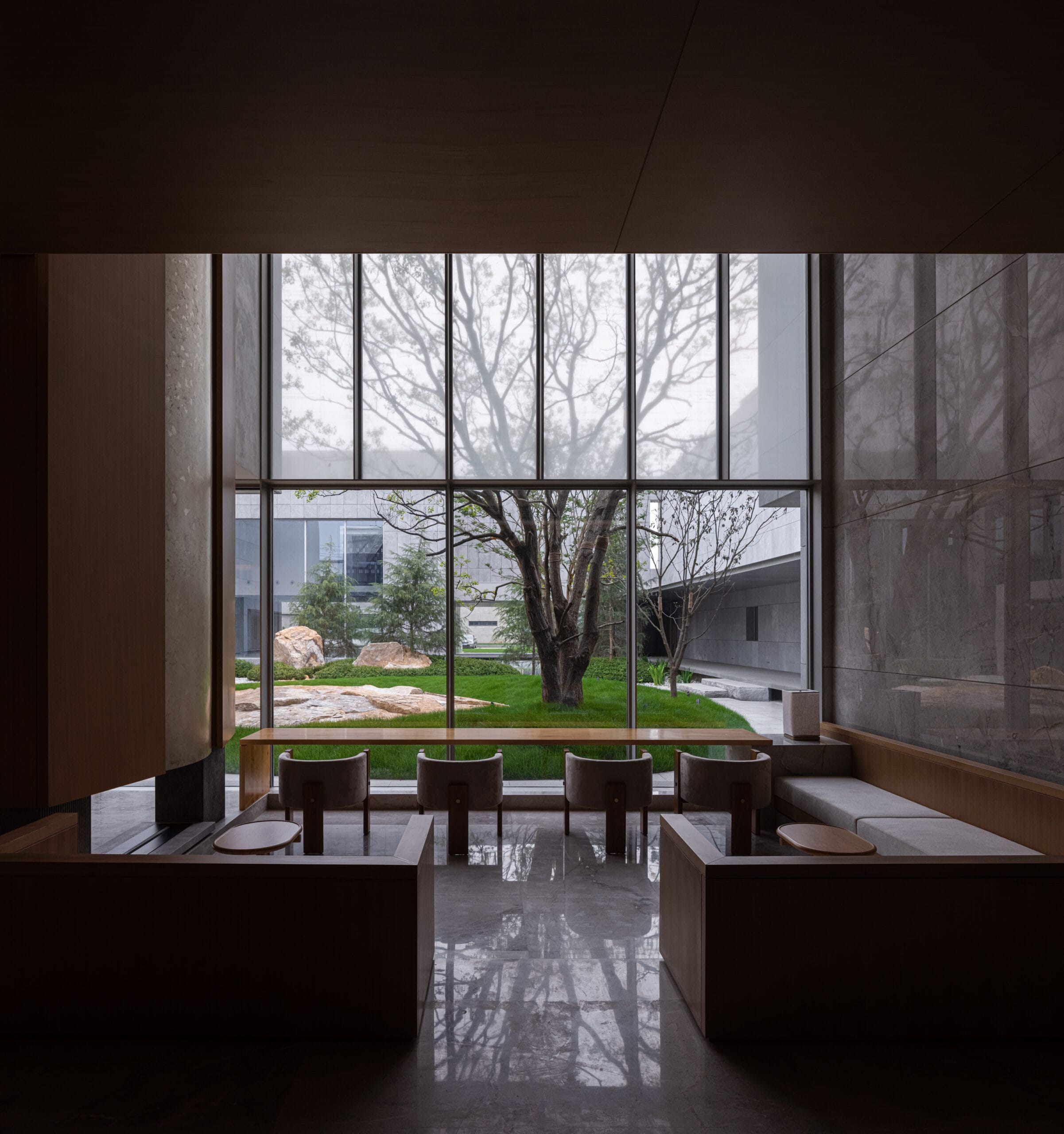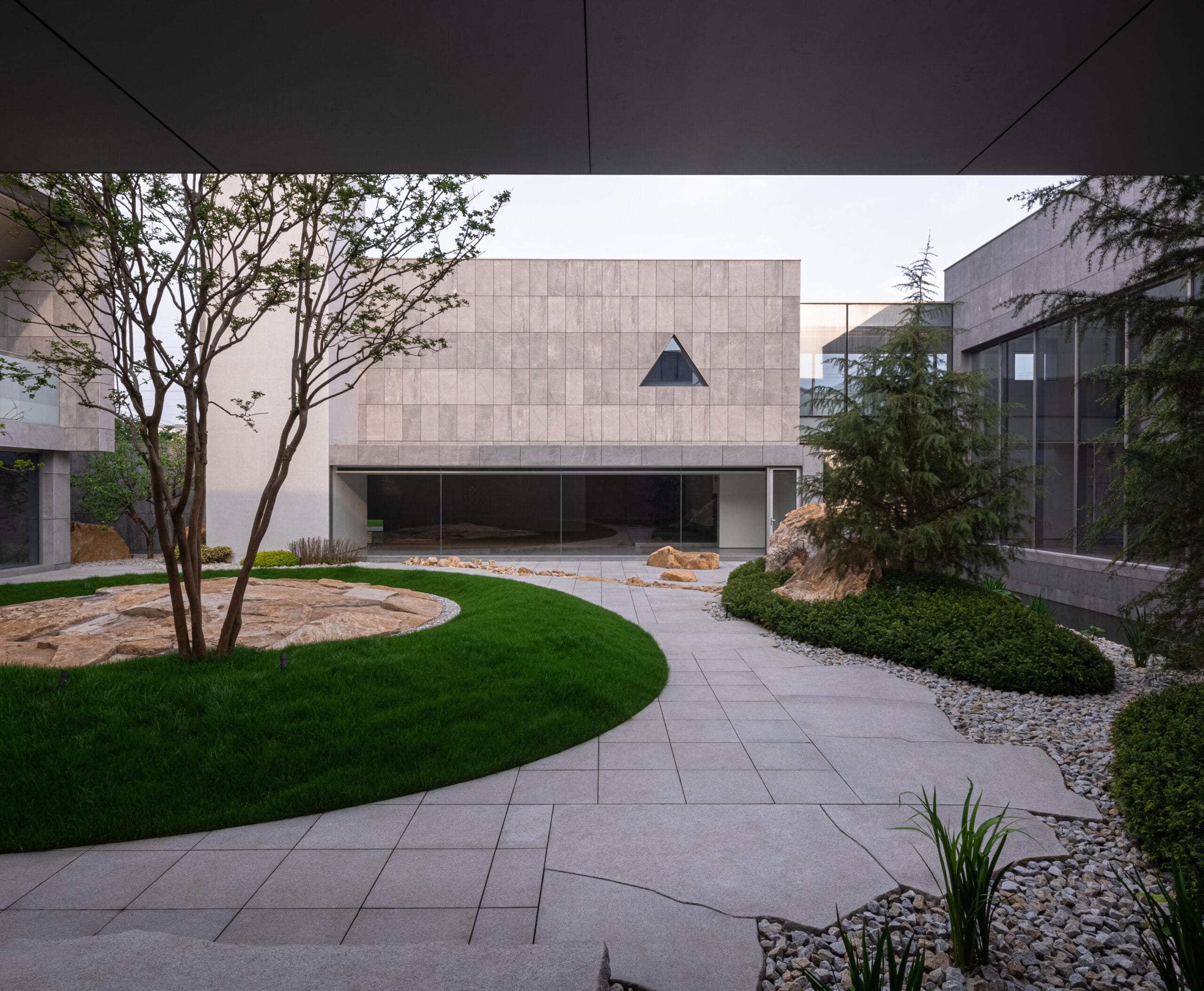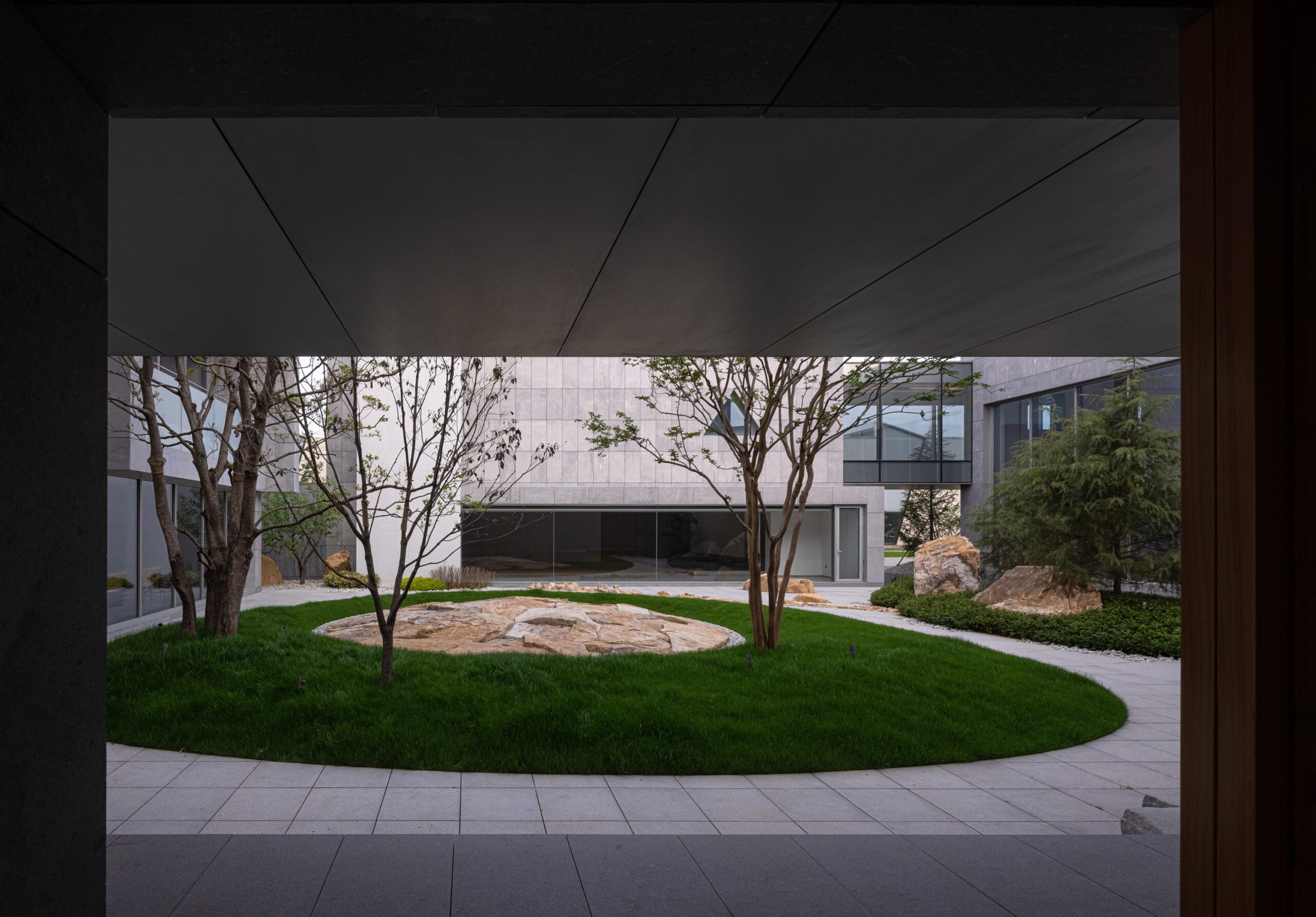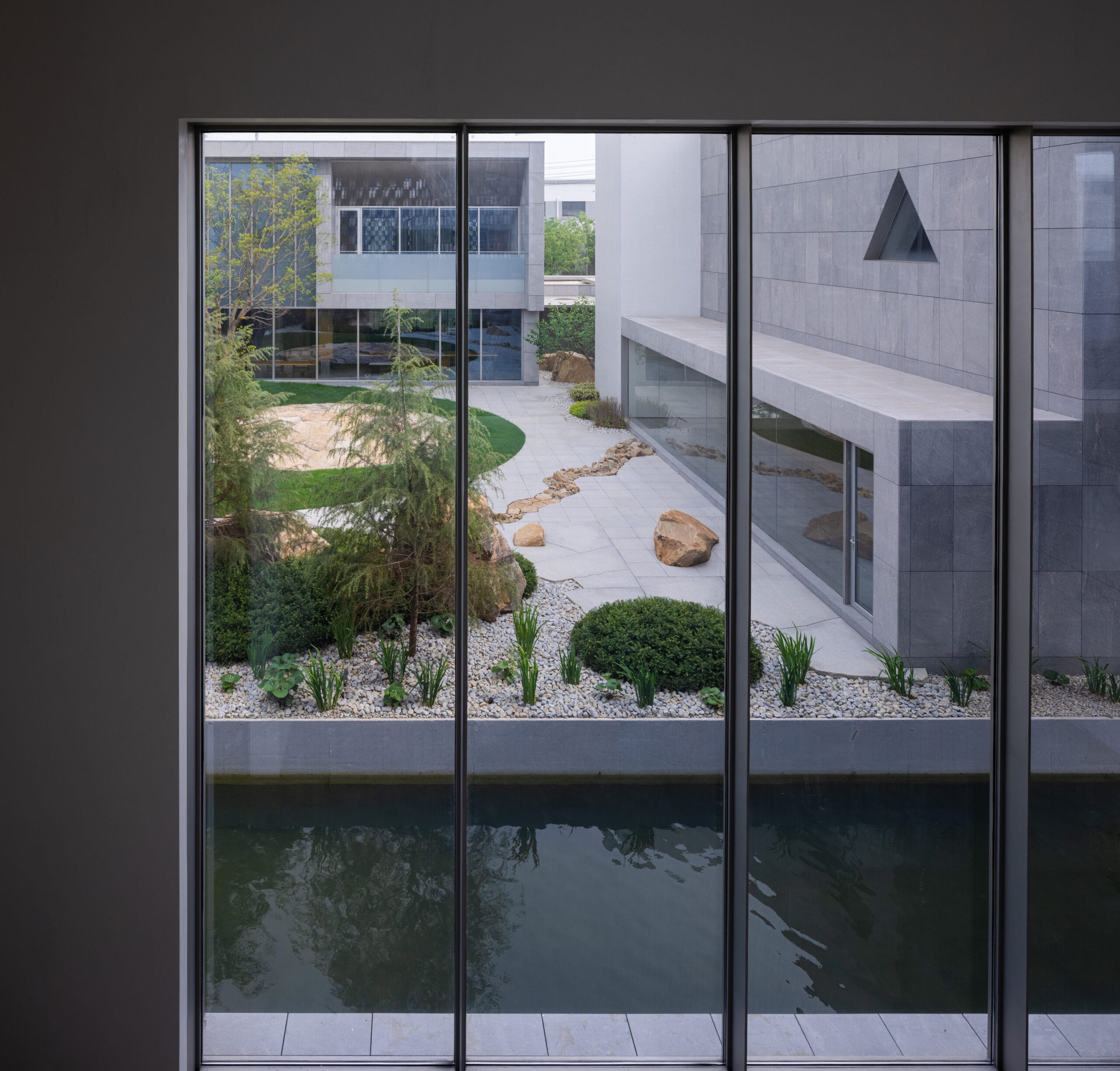 The overall spatial system of the project is located on the water, and the shape of the building and the order of the interior and exterior spaces are expressed in a modern and clean manner. The transitional corridor and large pieces of floor to ceiling glass create a flowing space. Therefore, the order of the landscape is crucial, as it needs to connect different functional areas and form a threedimensional, multi-dimensional and rich perceptual space between rows. The site is balanced by connecting three axes, creating a sense of spatial order. The longitudinal entrance extending internally is the focus of the design. The framing of the main atrium from different angles within the space requires the establishment of key line of sight points.