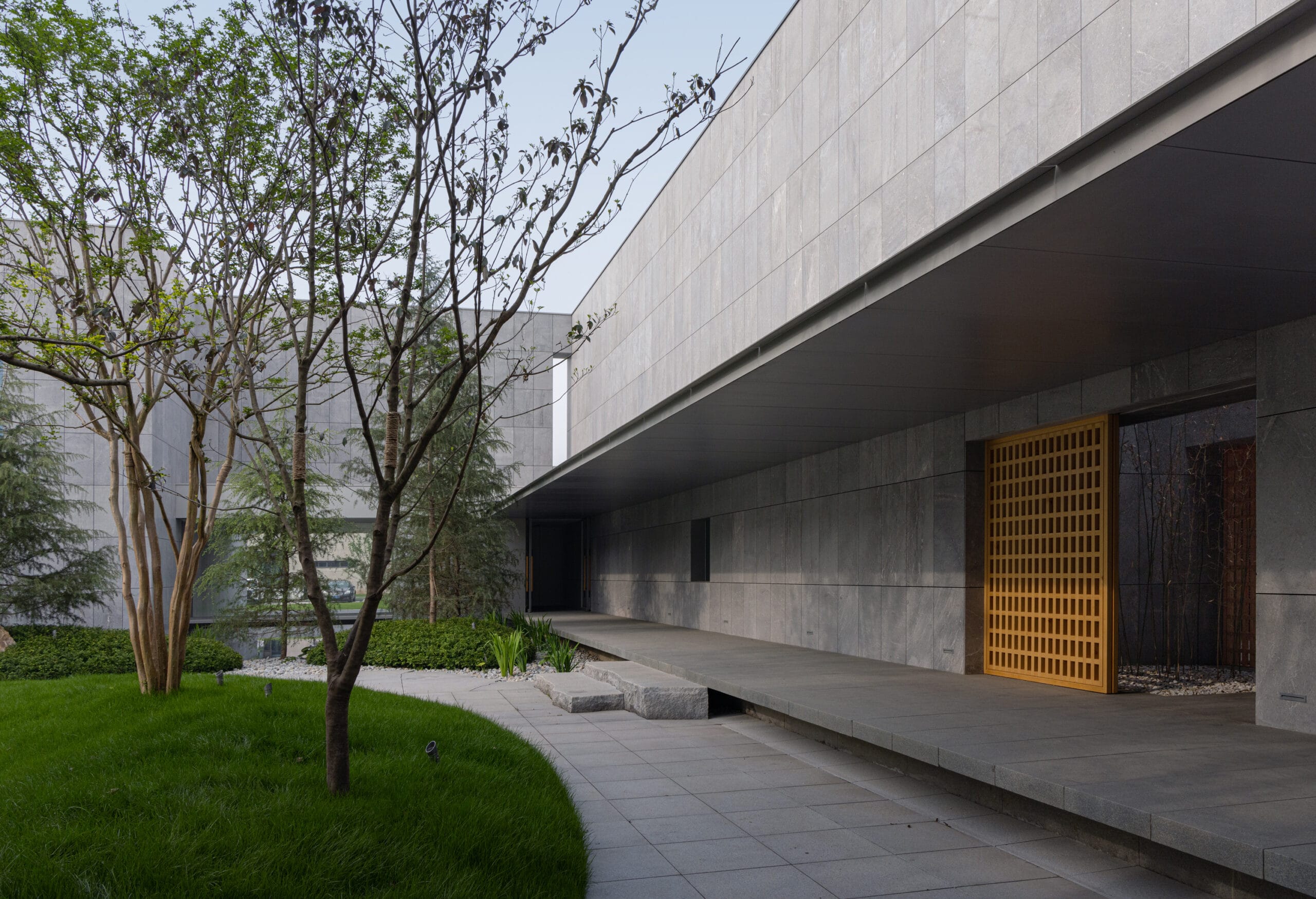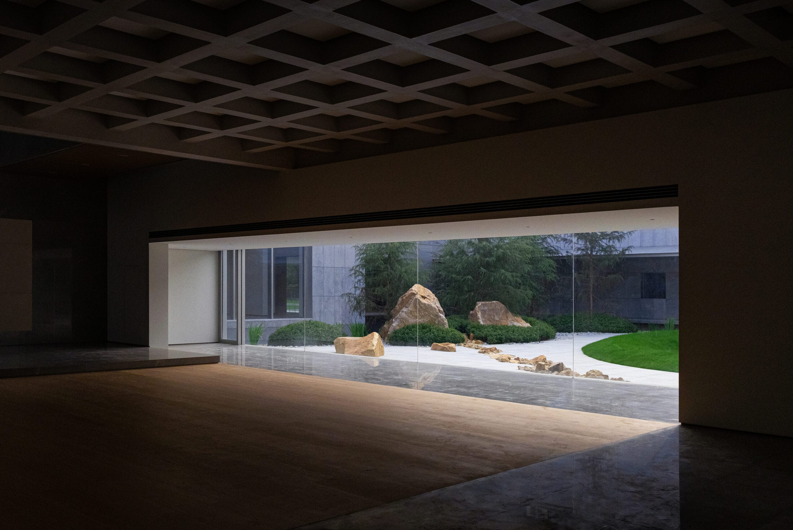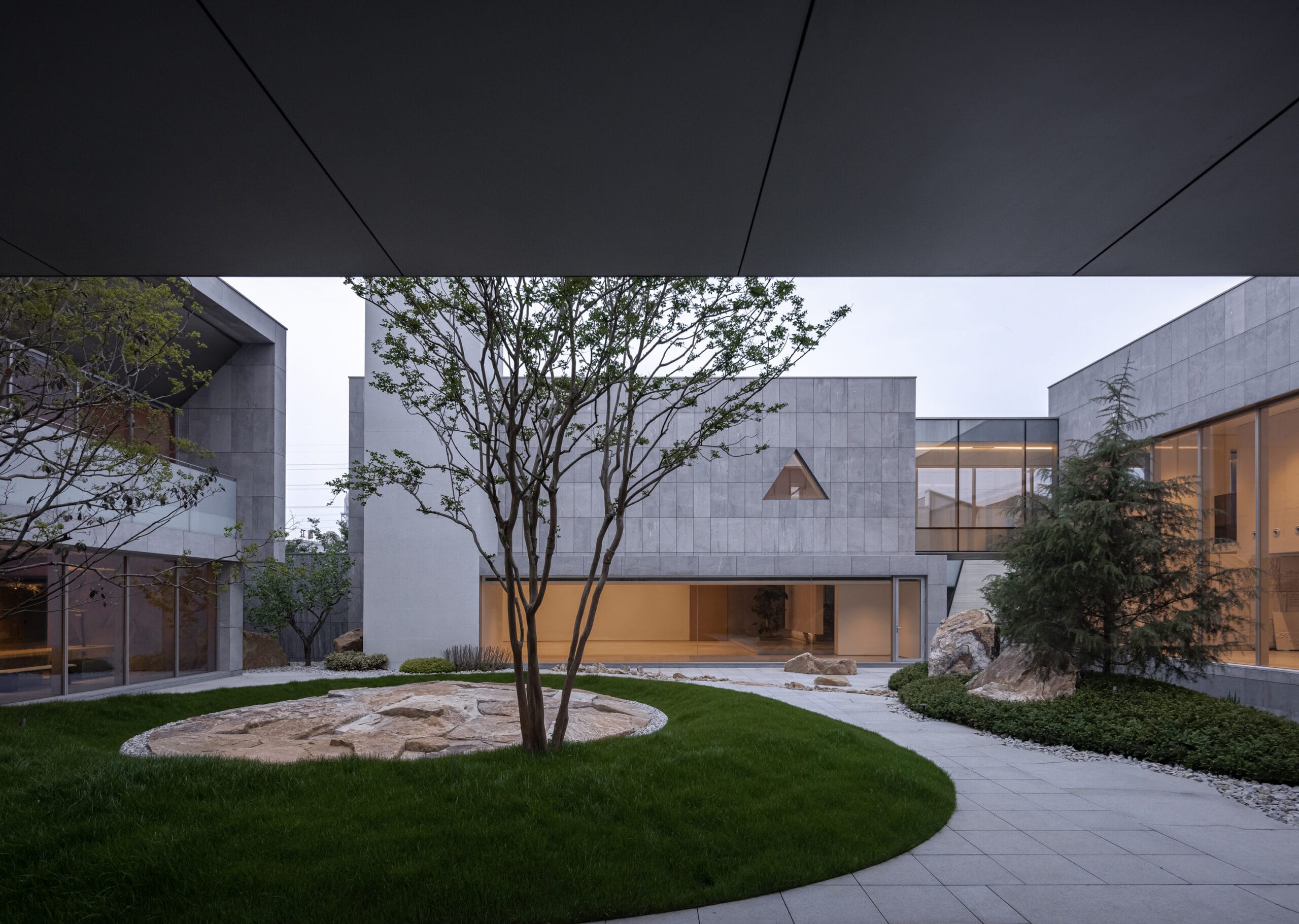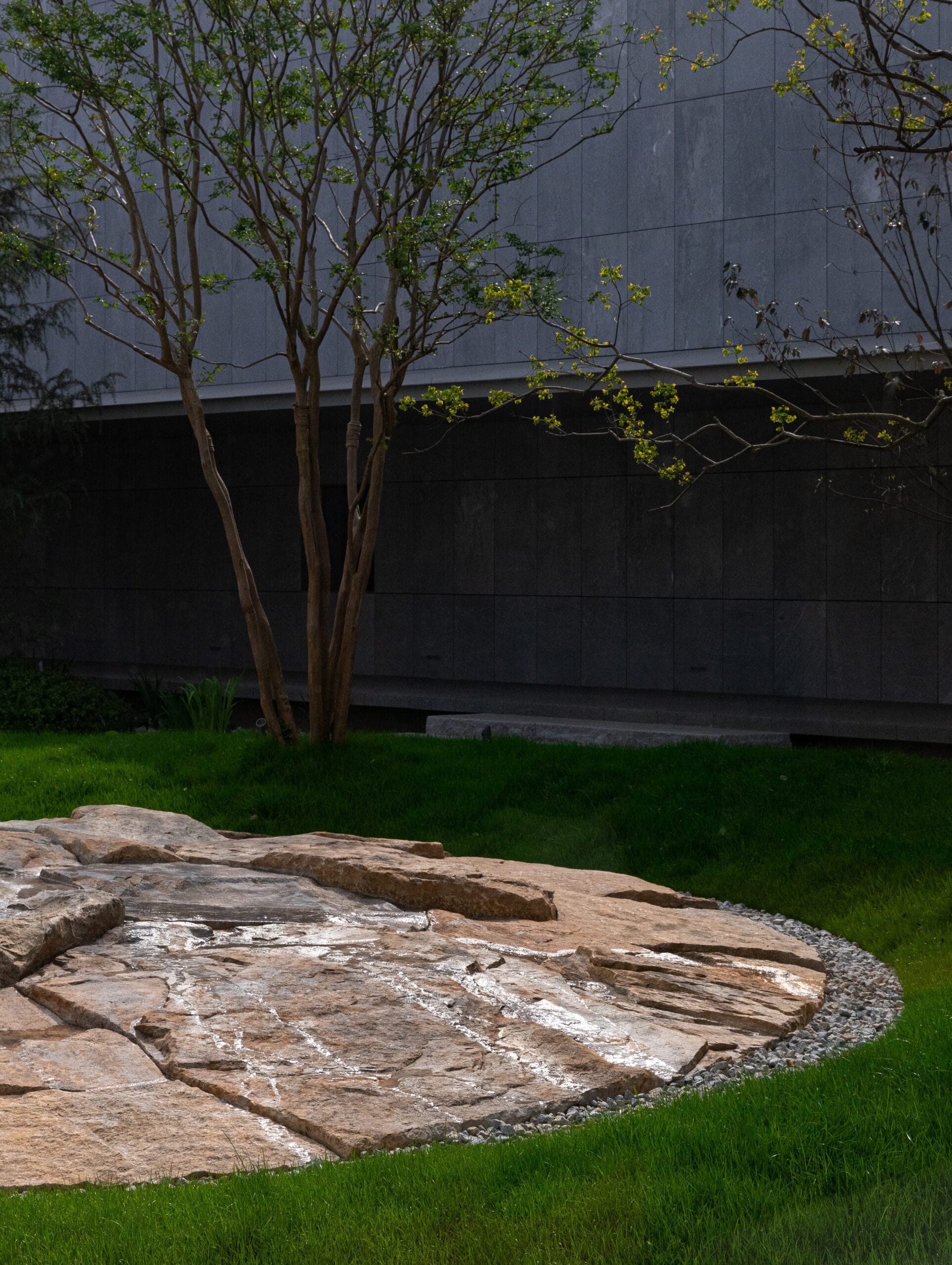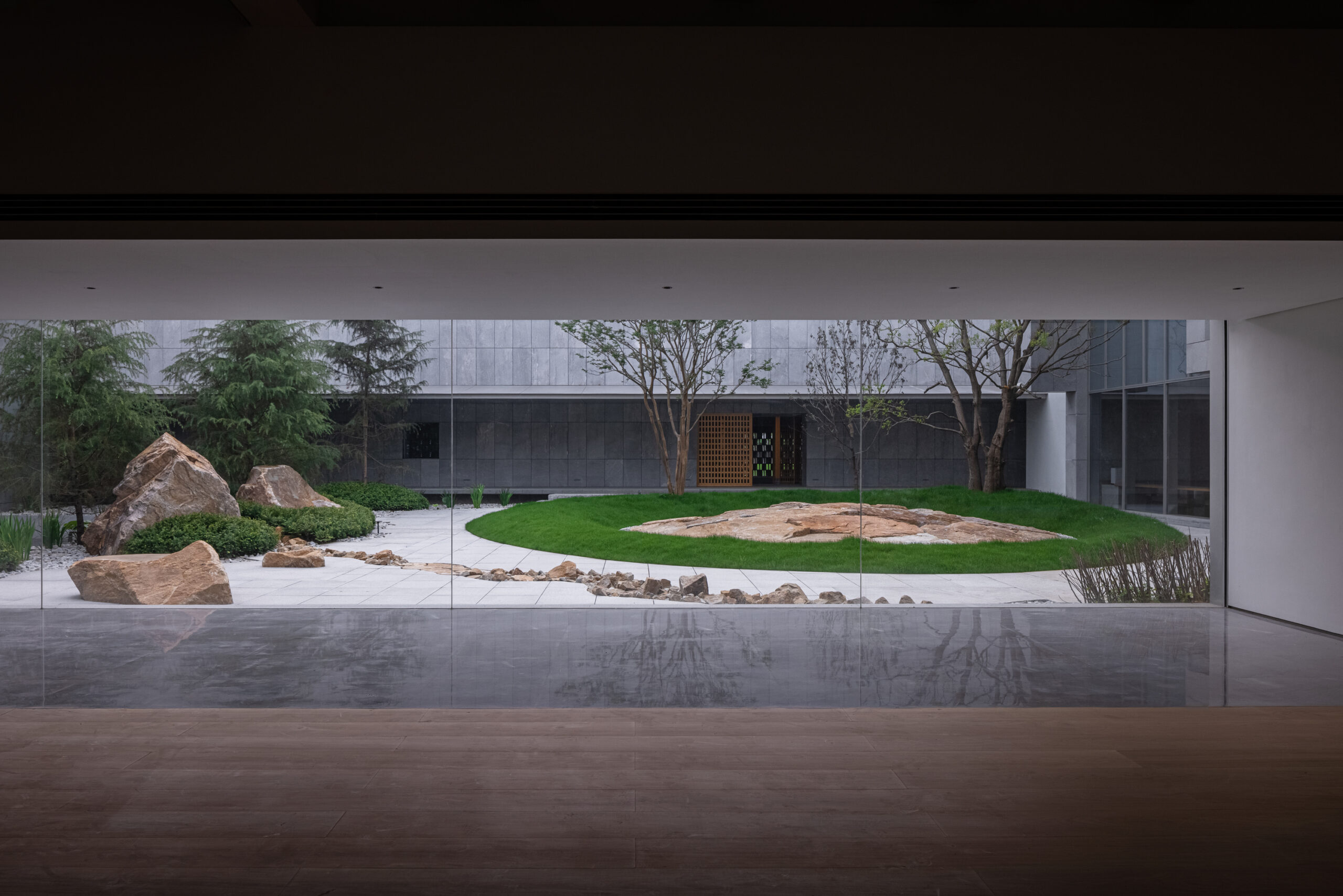 The overall spatial system of the project is located on the water, and the shape of the building and the order of the interior and exterior spaces are expressed in a modern and clean manner. The transitional corridor and large pieces of floor to ceiling glass create a flowing space. Therefore, the order of the landscape is crucial, as it needs to connect different functional areas and form a threedimensional, multi-dimensional and rich perceptual space between rows. The site is balanced by connecting three axes, creating a sense of spatial order. The longitudinal entrance extending internally is the focus of the design. The framing of the main atrium from different angles within the space requires the establishment of key line of sight points.
