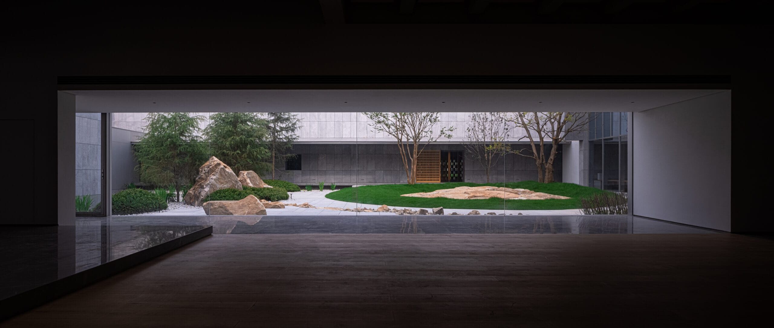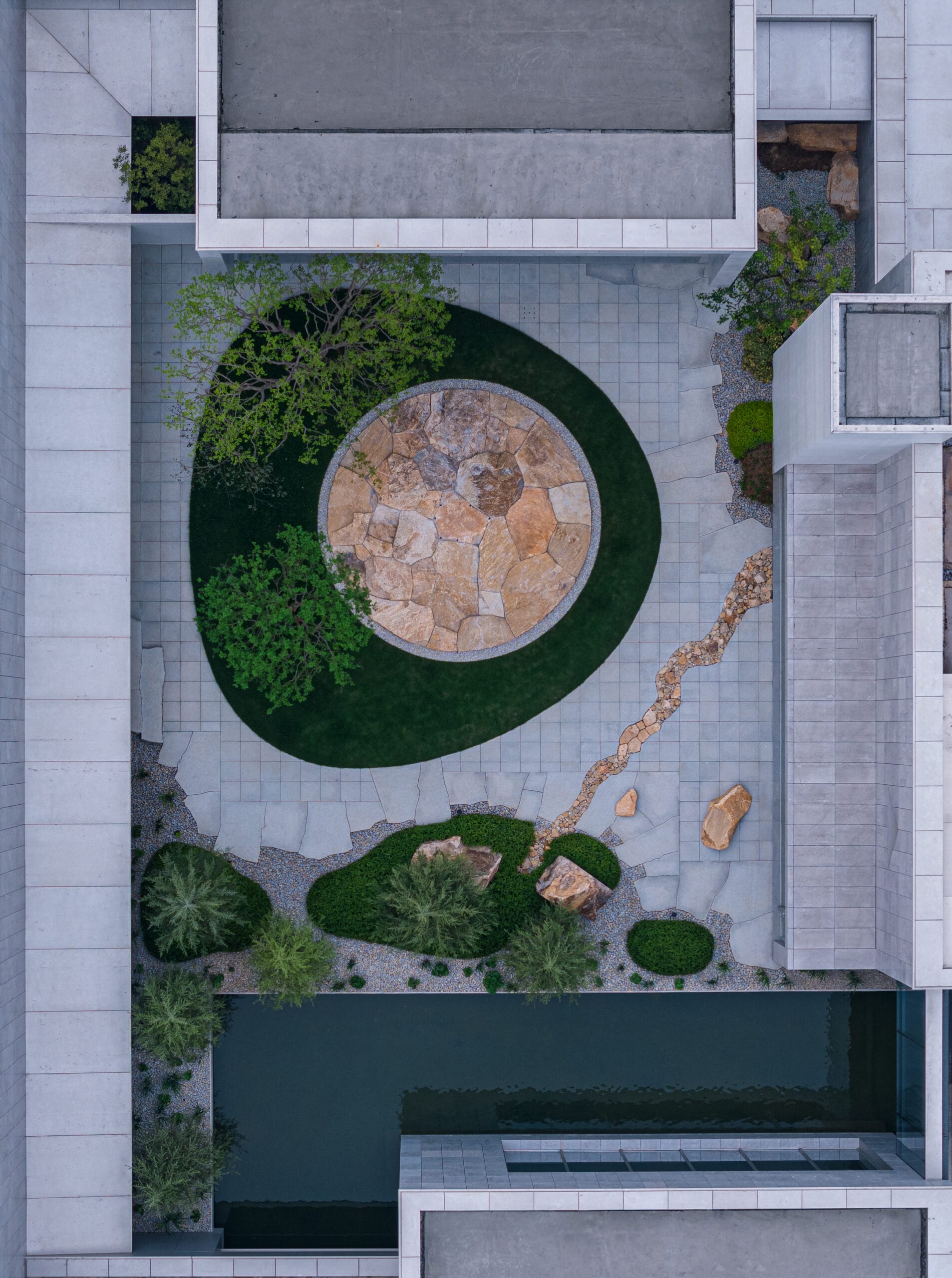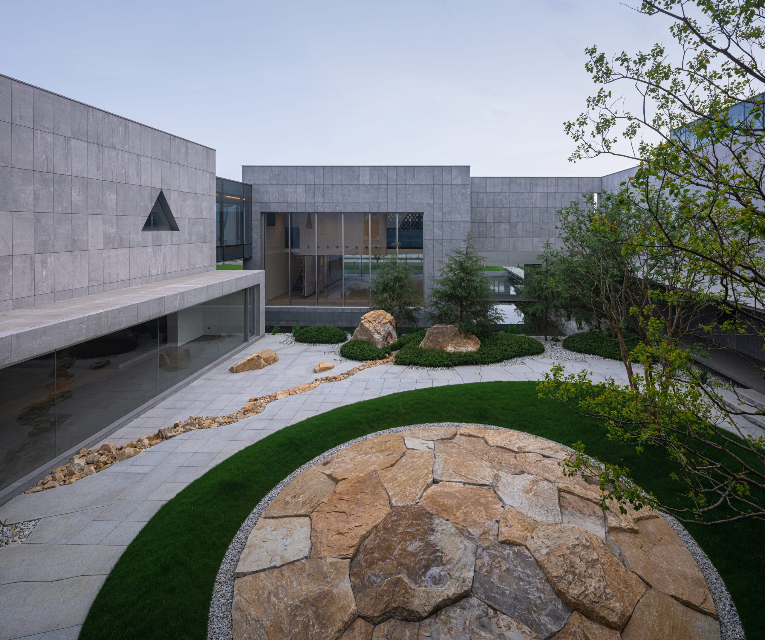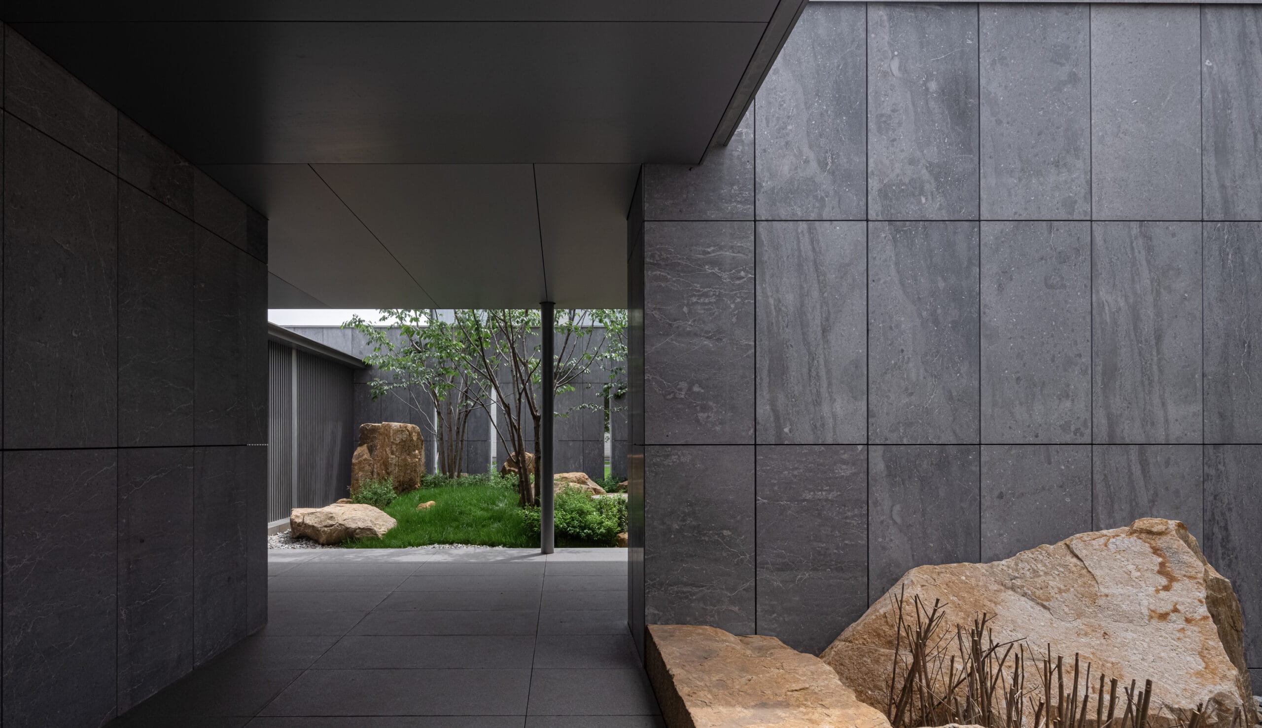 The overall spatial system of the project is located on the water, and the shape of the building and the order of the interior and exterior spaces are expressed in a modern and clean manner. The transitional corridor and large pieces of floor to ceiling glass create a flowing space. Therefore, the order of the landscape is crucial, as it needs to connect different functional areas and form a threedimensional, multi-dimensional and rich perceptual space between rows. The site is balanced by connecting three axes, creating a sense of spatial order. The longitudinal entrance extending internally is the focus of the design. The framing of the main atrium from different angles within the space requires the establishment of key line of sight points.
