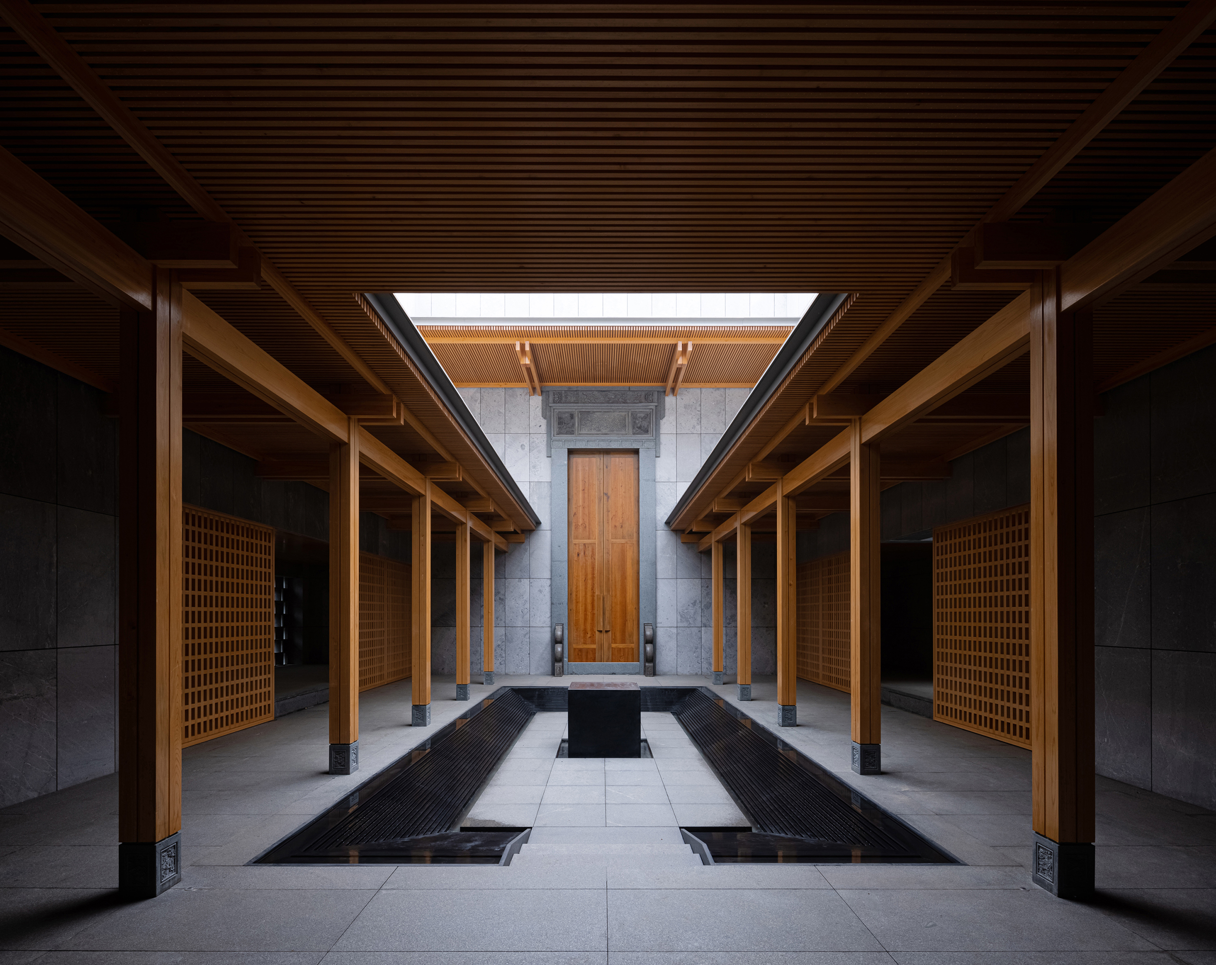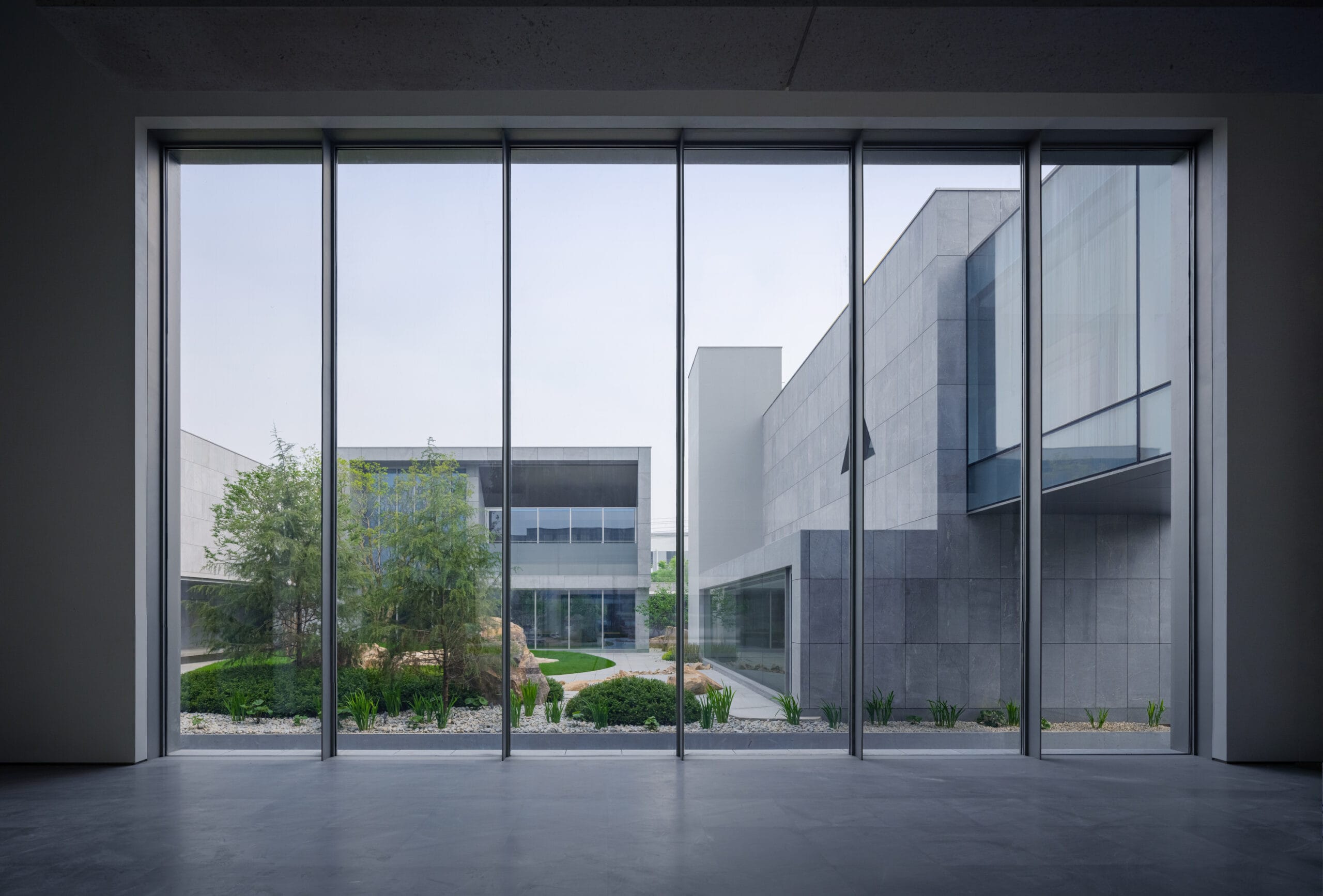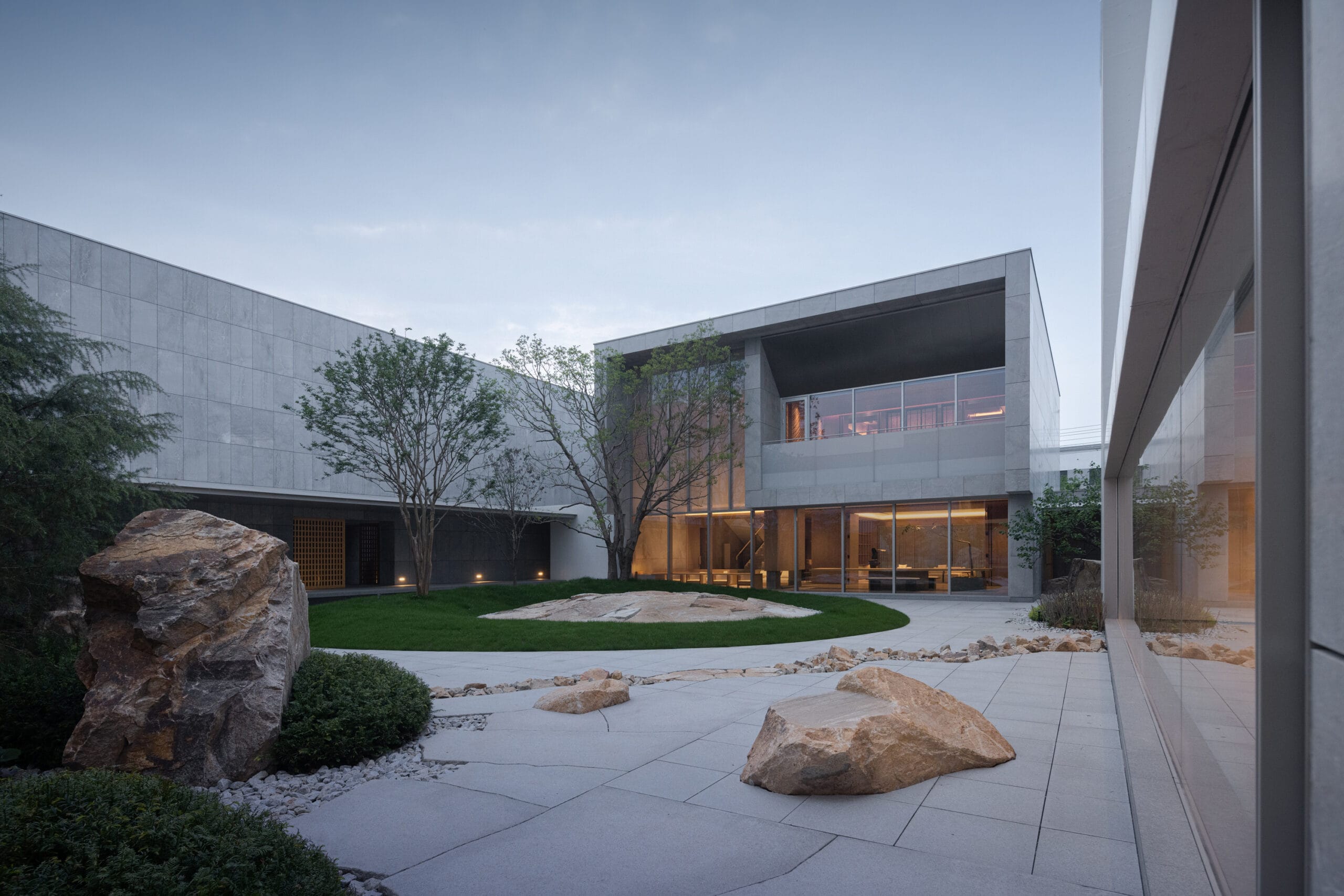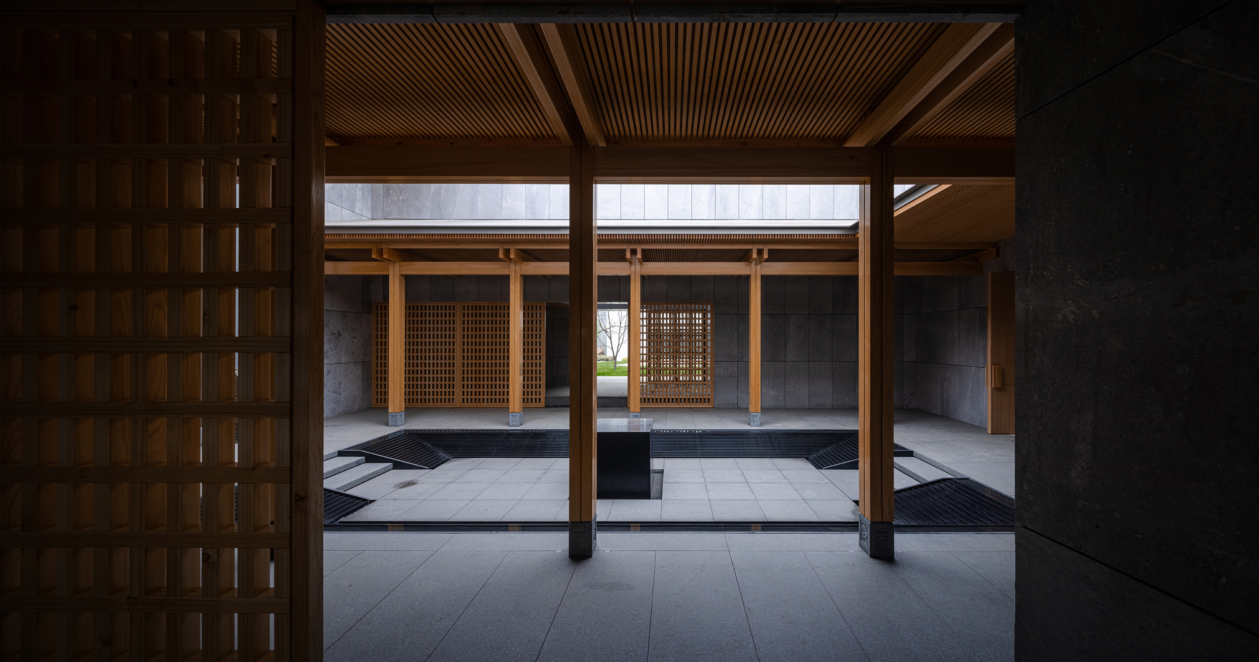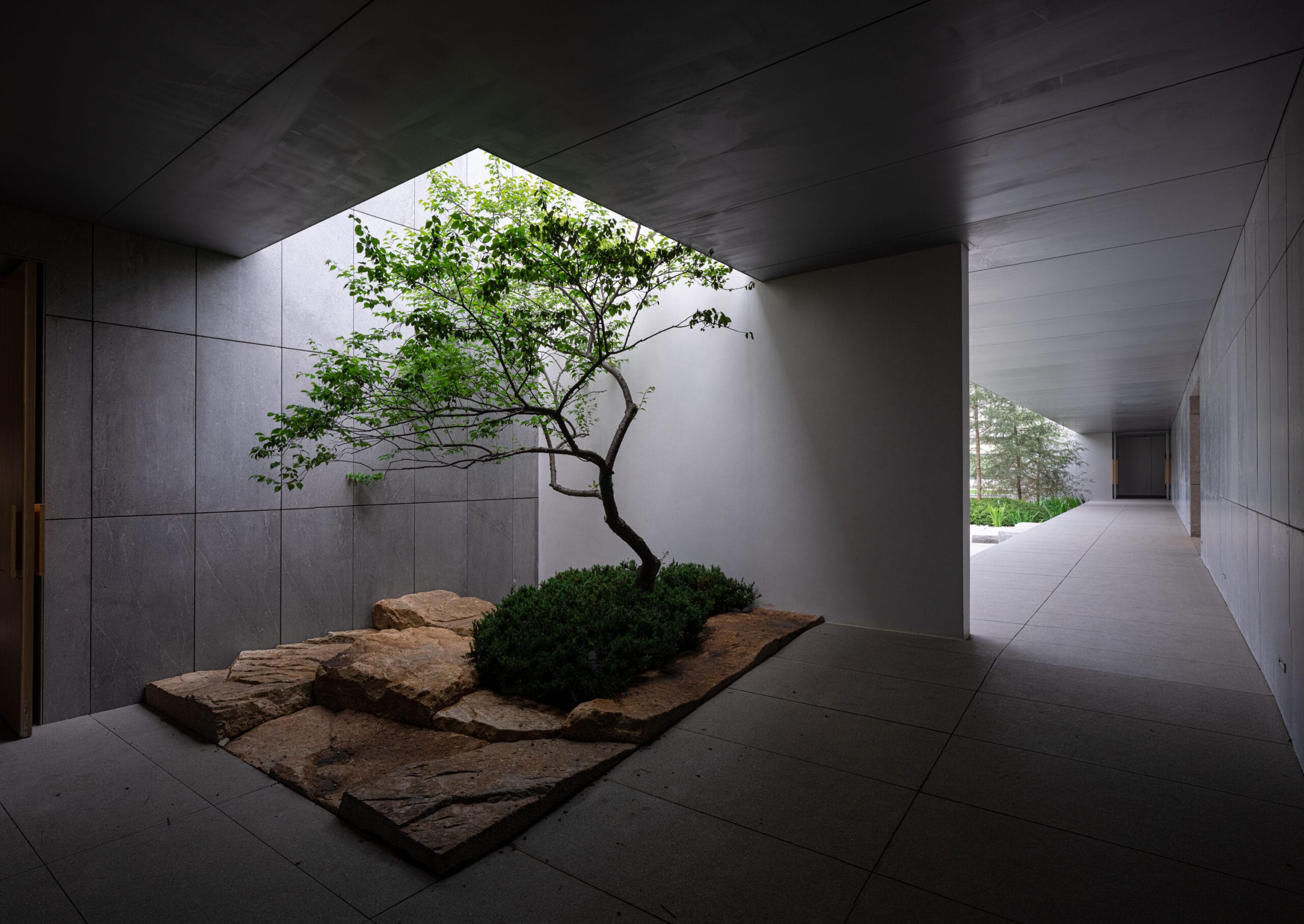 The overall spatial system of the project is located on the water, and the shape of the building and the order of the interior and exterior spaces are expressed in a modern and clean manner. The transitional corridor and large pieces of floor to ceiling glass create a flowing space. Therefore, the order of the landscape is crucial, as it needs to connect different functional areas and form a threedimensional, multi-dimensional and rich perceptual space between rows. The site is balanced by connecting three axes, creating a sense of spatial order. The longitudinal entrance extending internally is the focus of the design. The framing of the main atrium from different angles within the space requires the establishment of key line of sight points.