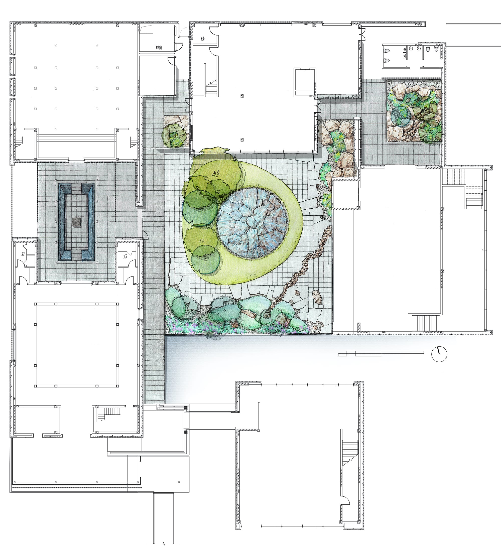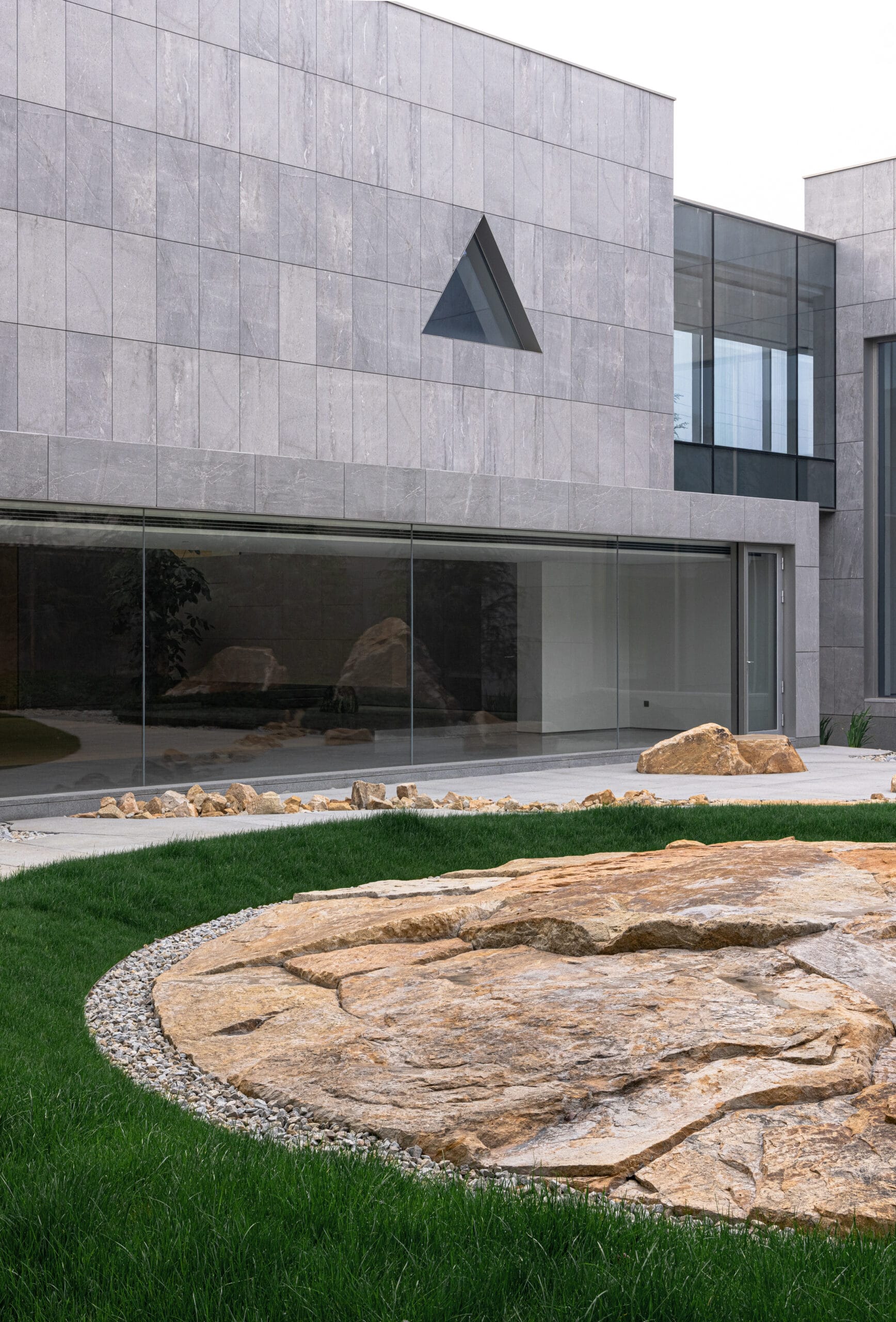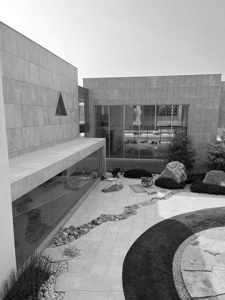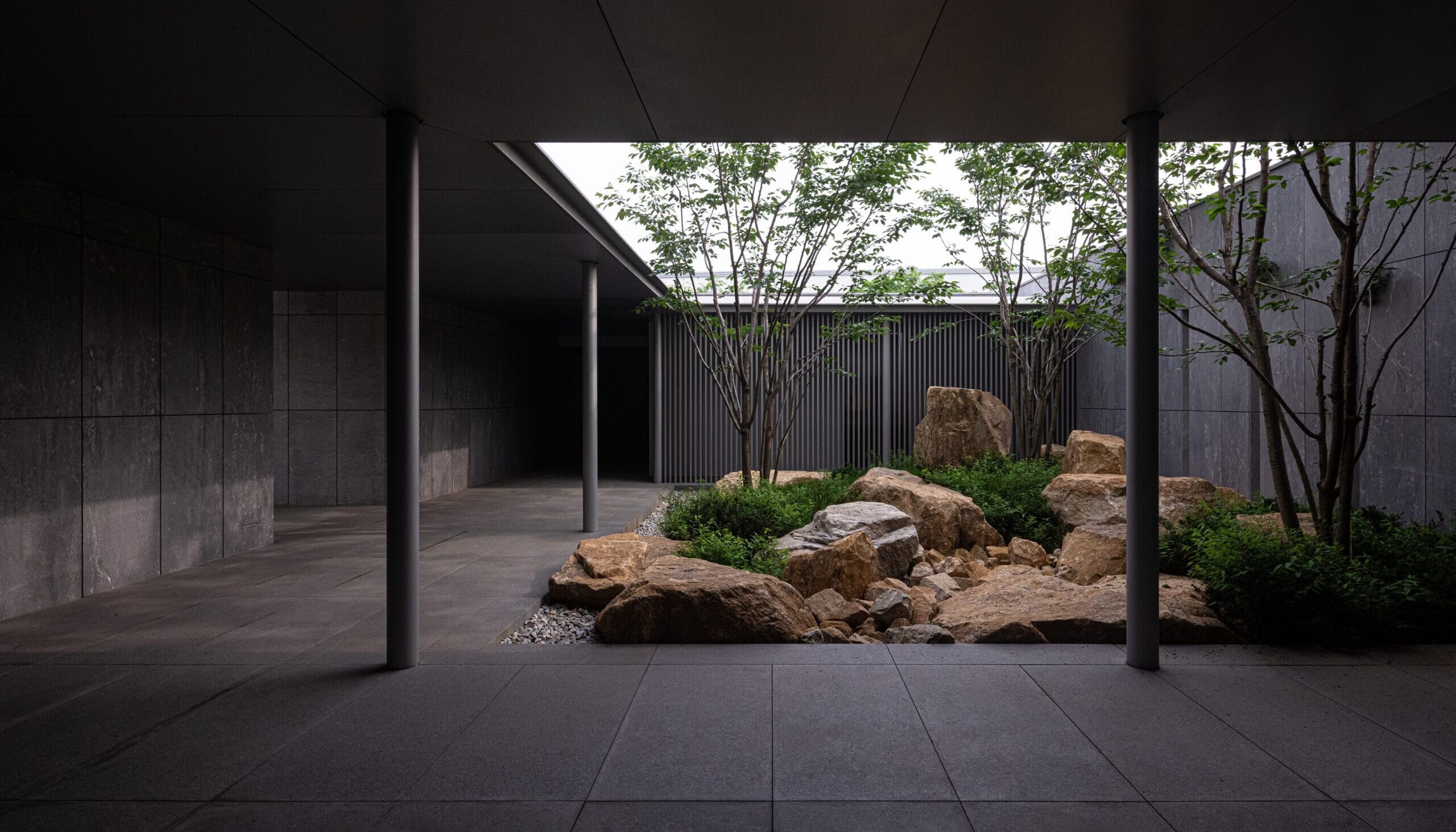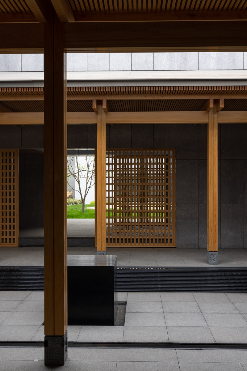 The overall spatial system of the project is located on the water, and the shape of the building and the order of the interior and exterior spaces are expressed in a modern and clean manner. The transitional corridor and large pieces of floor to ceiling glass create a flowing space. Therefore, the order of the landscape is crucial, as it needs to connect different functional areas and form a threedimensional, multi-dimensional and rich perceptual space between rows. The site is balanced by connecting three axes, creating a sense of spatial order. The longitudinal entrance extending internally is the focus of the design. The framing of the main atrium from different angles within the space requires the establishment of key line of sight points.